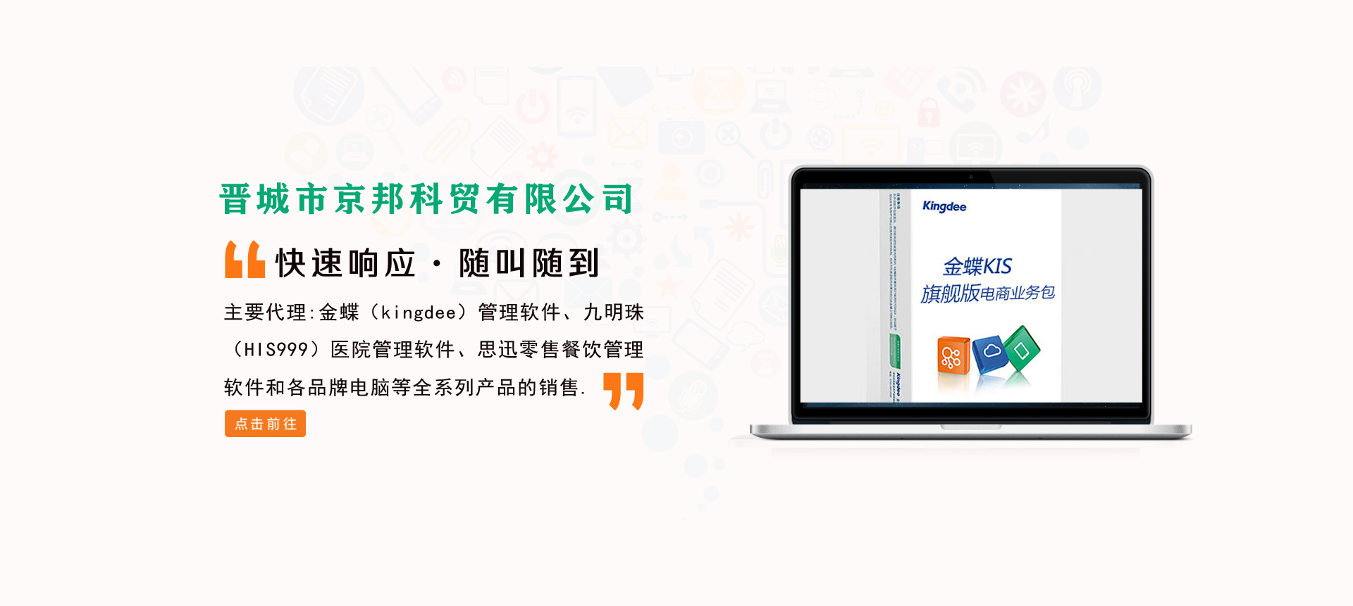 晉城市京邦科貿(mào)有限公司成立于2006年,是經(jīng)晉城市工商行政管理局登記注冊,主要從事軟件銷售、電腦銷售和企業(yè)管理咨詢等相關(guān)業(yè)務(wù),是金蝶軟件(中國)有限公司、深圳九明珠信息科技有限公司、深圳萬國思迅軟件有限公司在晉城地區(qū)高級(jí)代理商,主要代理金蝶(kingdee)管理軟件、九明珠(HIS999)醫(yī)院管理軟件、思迅零售餐飲管理軟件和各品牌電腦等全系列產(chǎn)品的銷售。